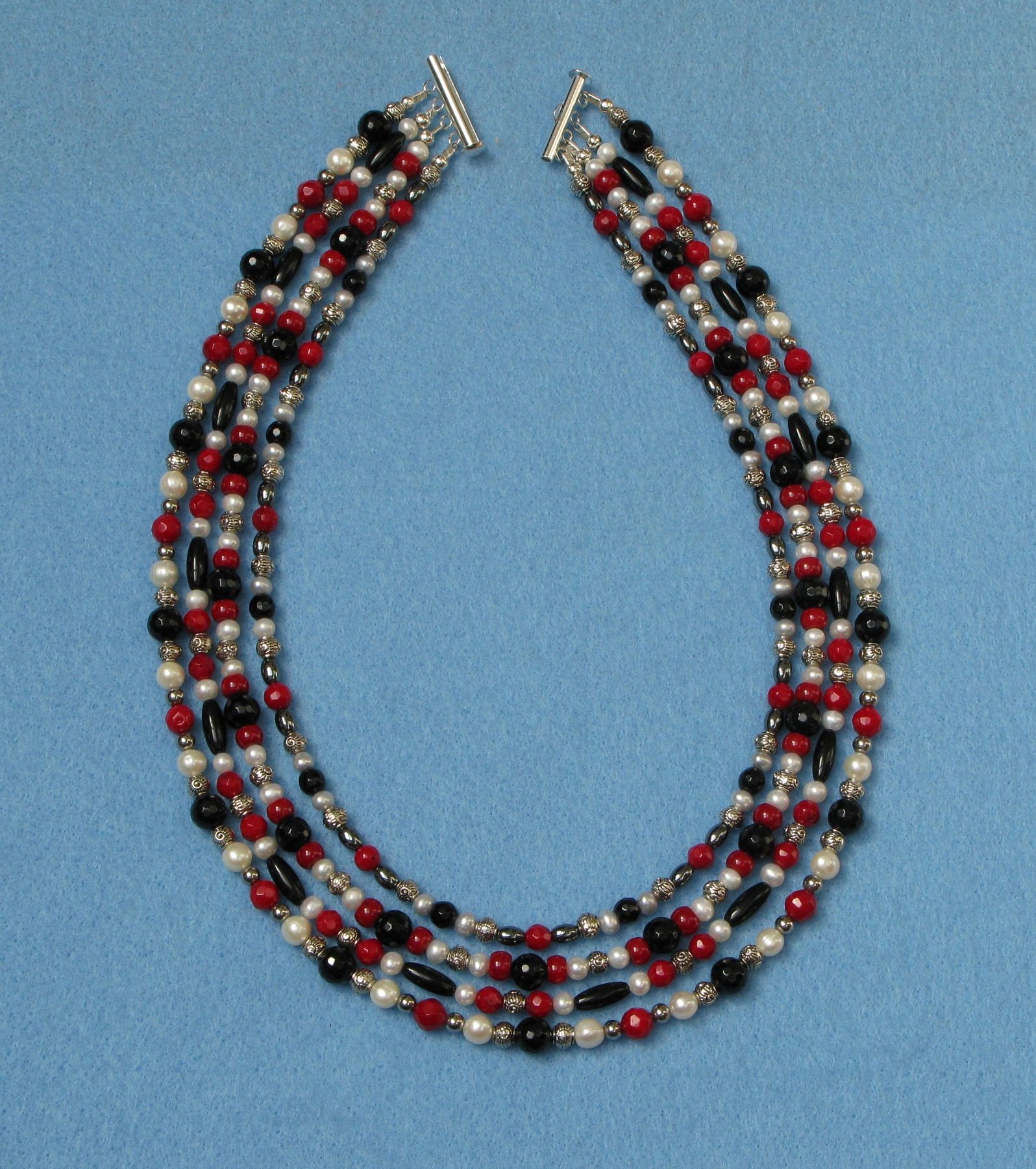 Four strand white, grey, and bronze pearl, onyx and crystal necklace, sterling silver clasp, 18 1/2 inches, $140.