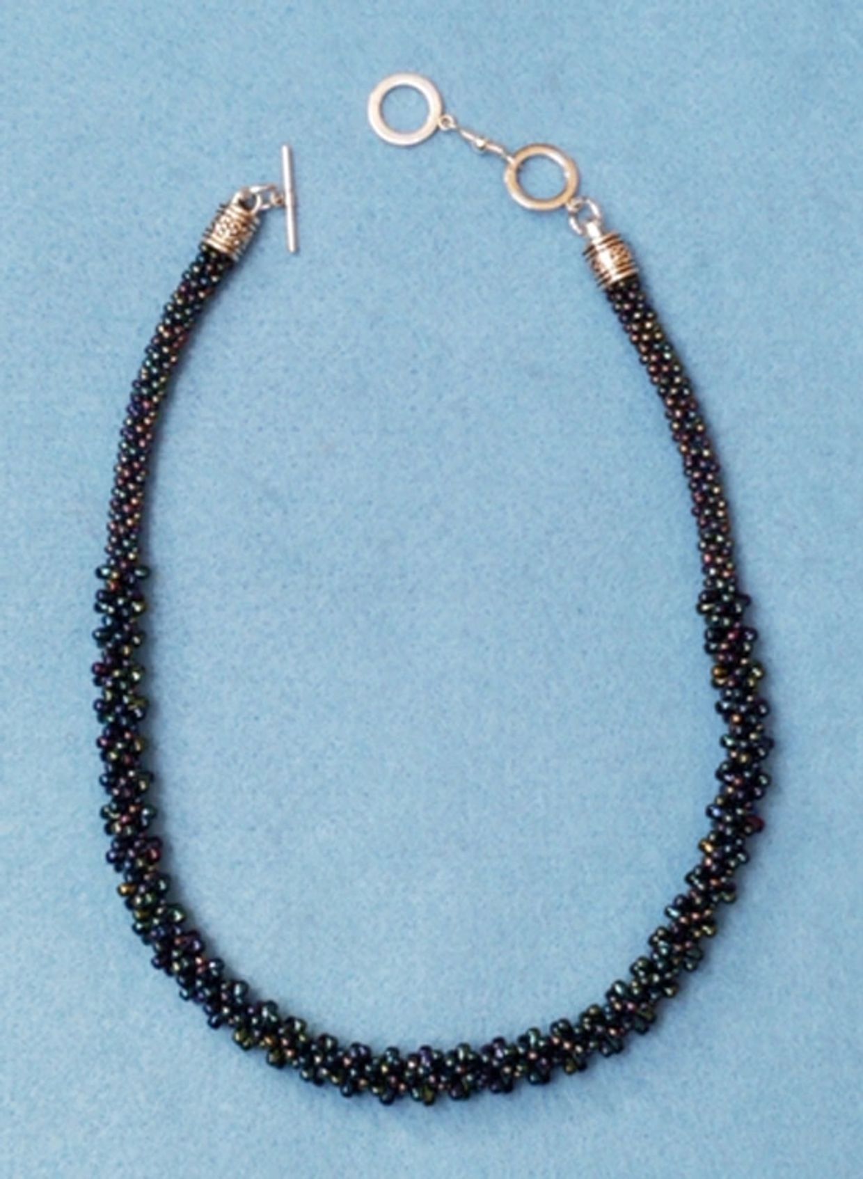 Fresh-water pearl necklace on gold-colored chain, hand-made spiral headpins, 24 inches plus 4 1/2 inch dangle, $240.